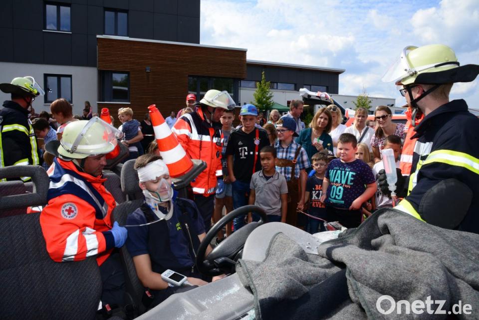 Dazu gehörte die Entfernung der Windschutzscheibe, dann wurde das Dach des Fahrzeuges abgetrennt. Damit ergab sich für die Helfer der gesamte Überblick über den Fahrzeugraum und die verletzten Personen. Das war für die Besucher der Moment, sich der „Unfallstelle“ nähern zu dürfen. Notarzt Dominik Kuhbandner erklärte den Zuschauern die Notwendigkeit der medizinischen Maßnahmen. Dann mussten die Zuschauer die „Schadensstelle“ wieder verlassen, damit die Rettungsmaßnahmen wieder aufgenommen werden konnten.