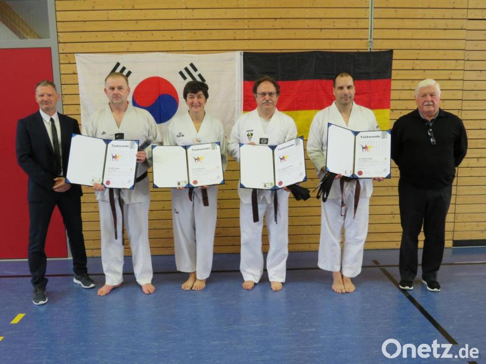 Erste Disziplin war die Präsentation einer Form aus einer Auswahl von sieben bisher erlernten. Der Prüfer wählte sie kurz vor Beginn aus. Die zweite Disziplin, Ilbo-Taeryon (Ein-Schritt-Kampf), erfordert die Abwehr eines Angriffs mit Hand- und Fußtechniken und deren Variationen. In der dritten Disziplin werden bei Prüflingen über 40 Jahren sogenannte Sequenzen (Auszüge aus Formen) statt Wettkampf mit Vollausrüstung geprüft. In der vierten Disziplin wird die Abwehr von Angriffen mit und ohne Waffen gezeigt. Highlight der Prüfung ist der Bruchtest. Nach Addition der Gesamtpunktzahl konnten die Prüflinge endlich die Früchte ihres jahrelangen Trainings ernten. Als Mitglieder der DTU haben sie in über fünf Jahren neun Gürtelprüfungen hinter sich gebracht, zahlreiche Lehrgänge besucht und in den wöchentlichen vier Trainingseinheit eine Menge Schweiß vergossen. Der schwarze Gürtel war nun der Lohn für Eveline Bauer (54), Joachim Freisleben (55), Martin Janker (47) und Michael Raab (50).