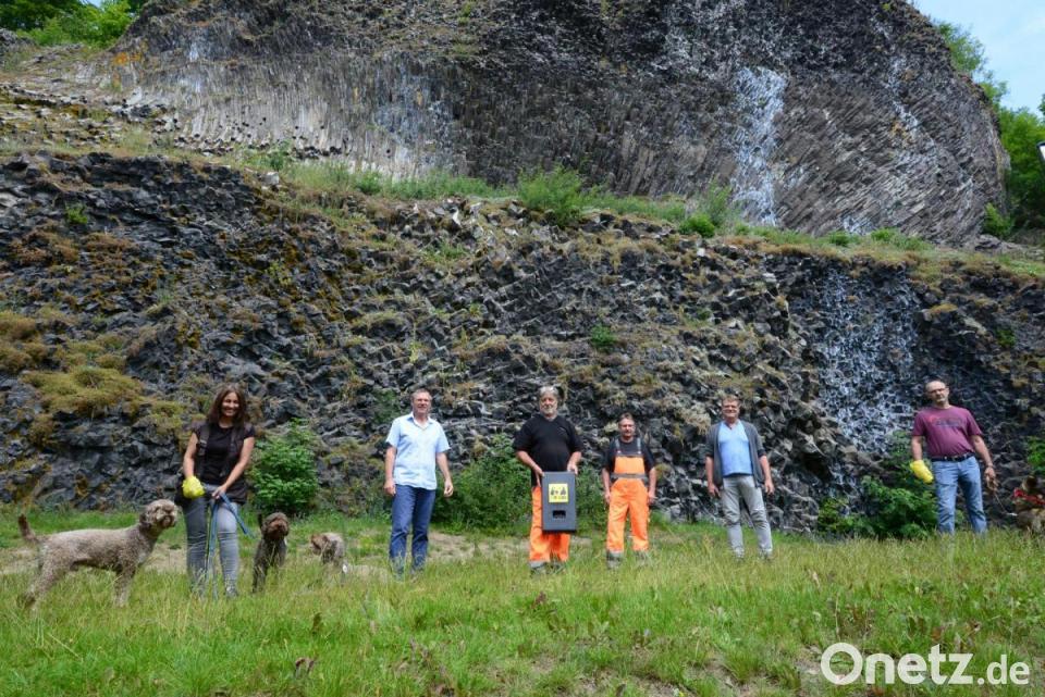 Am Montagvormittag übergab Bürgermeister Reinhard Sollfrank symbolisch diese Tüten unter der Basaltwand an die Hundebesitzer Nicole Holtmeier mit ihren drei Hunden italienischer Rasse. Diese Hunde haben eine Ausbildung zur Flächensuche beim BRK-Weiden hinter sich. Damit nehmen sie jeden menschlichen Geruch wahr, nicht von einzelnen Personen. "Sie finden damit in einem bestimmten Areal jeden Menschen", erklärt Nicole Holtmeier.