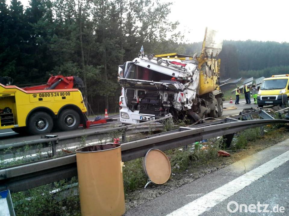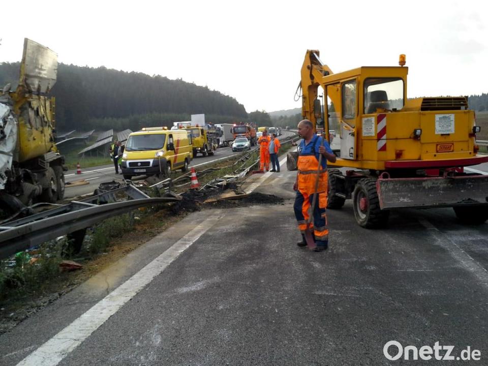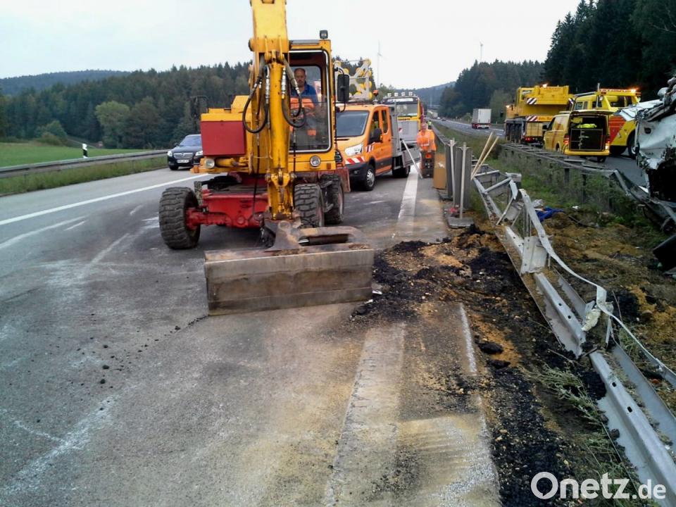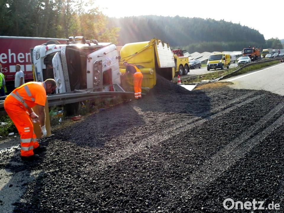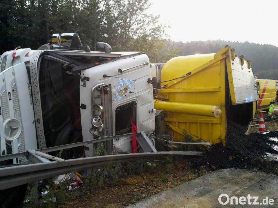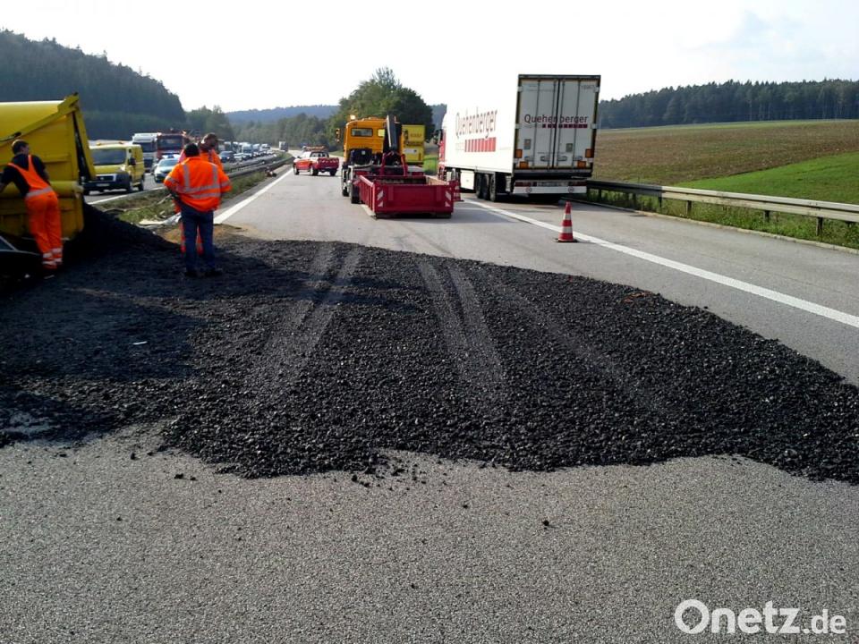 Parsberg/Beratzhausen. Ein mit Asphalt beladener Lastwagen ist auf der Autobahn 3 umgekippt. Weil der Asphaltbehälter durch den Aufprall beschädigt wurde, lief ein Teil der 17 Tonnen schweren Ladung zwischen den Anschlussstellen Parsberg und Beratzhausen quer über die in Nürnberg führende Fahrbahn. Zuvor hatte die Polizei berichtet, dass es sich um "frischen Teer" gehandelt hätte. Auf Nachfrage berichtigte ein Sprecher am Mittwochmorgen und stellte klar, dass es sich bei der Substanz um Asphalt gehandelt hatte.
