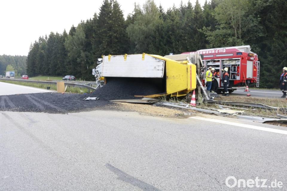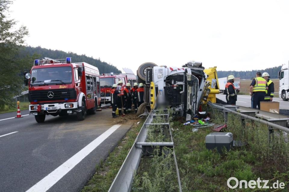 Auf der A3 bei Parsberg kam es am Dienstagnachmittag in Fahrtrichtung Regensburg zu einem schweren Lkw-Unfall. Ein 42-jähriger Fahrer aus dem Landkreis Cham fuhr auf der A3, als ihm ein Reifen platzte und der Lkw ins Schleudern kam. Der mit Teer beladene Lkw stürzte um und landete auf der Mittelschutzplanke. Er wurde in seinem Führerhaus eingeklemmt und musste von der Feuerwehr mit schwerem Gerät befreit werden. Er kam verletzt in die Klinik nach Regensburg. Die Autobahn wurde in beide Fahrtrichtungen gesperrt. Ein weiterer Lkw, der auf der Gegenspur unterwegs war, wurde von Trümmerteilen auf der Windschutzscheibe getroffen. Der Teer verteilte sich außerdem auf der Fahrspur. Die Bergung zieht sich bis in den Abend, teilen die Rettungskräfte mit.