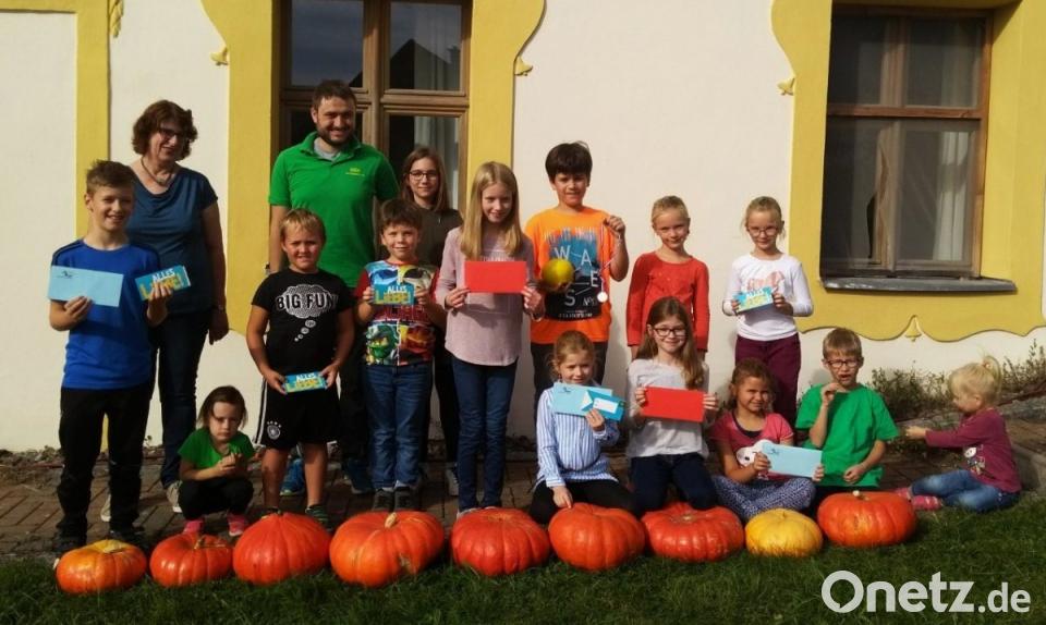 Vorsitzender Hubert Ott (Dritter von links) und Stellvertreterin Christine Felbinger (Zweite von links) nahmen die Preisverteilung vor. Gewonnen hat Malin Jacobi (hinten, Dritte von links), dessen Kürbis 12,8 Kilogramm wog. Auf dem 2. Platz folgte Magdalena Heldmann (Vierte von rechts); ihr Kürbis brachte es auf 10,5 Kilogramm. Dritte wurde Christina Heldmann (vorne, Vierte von rechts), deren Kürbis 9,4 Kilogramm erreichte.
