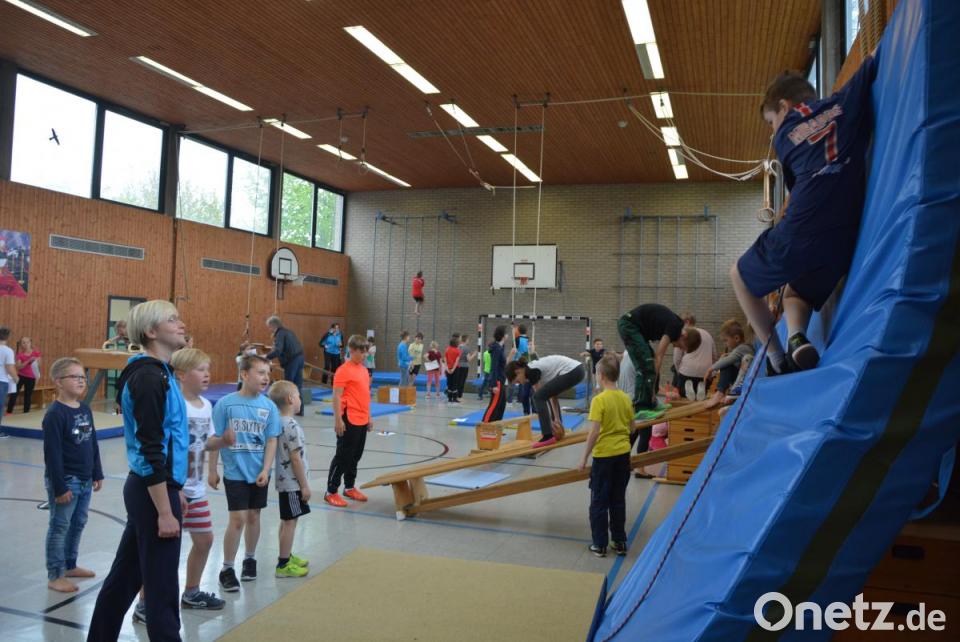 Aufgebaut war in der Schulturnhalle ein 17 Stationen umfassender Bewegungsparcours, den die Kinder anhand eines Laufzettels zu durchlaufen hatten. Gefragt war unter anderem das Können an einer Kletterwand, an einer Hängebrücke, auf einer "Affenschaukel", an einem Klettertunnel oder beim Zielwerfen. Lustig ging es zu bei den Stationen "Mutsprung", "Wetterfrosch", "Rauf in den Sattel" und "Faultier". Geschicklichkeit war beim Eierlaufen gefragt.