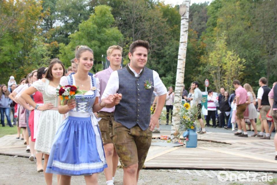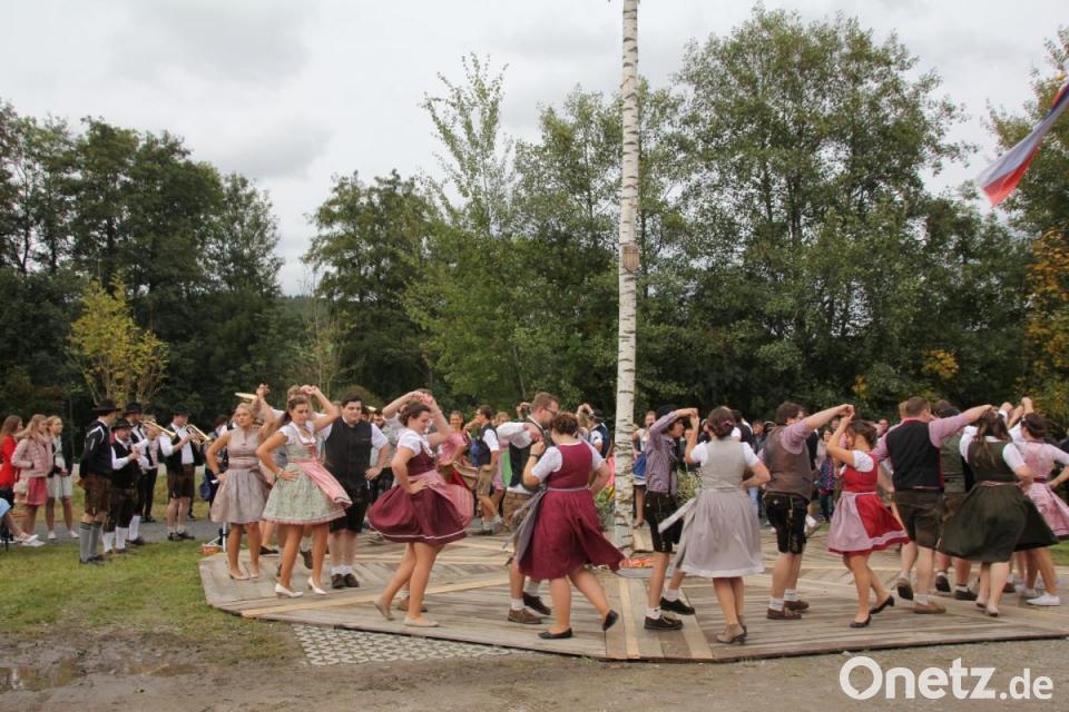 Den Höhepunkt des Nachmittags bildeten die Tänze der 21 Kirwapaare um den bereits am Vortag aufgestellten Kirwabaum. Die Kirwaburschen zeigten dabei sogar hervorragende Qualitäten als Schuhplattler, und die feschen Dirndlkleider der jungen Frauen wehten bei den flotten Tänzen nur so durch die Luft. Per Wurf mit einem Blumenstrauß wurde dann noch das neue "Oberkirwapaar" ermittelt, das die Veranstaltung im nächsten Jahr federführend ausrichten wird: Sara Zwack und Benedikt Fink kommt diese Aufgabe zu.