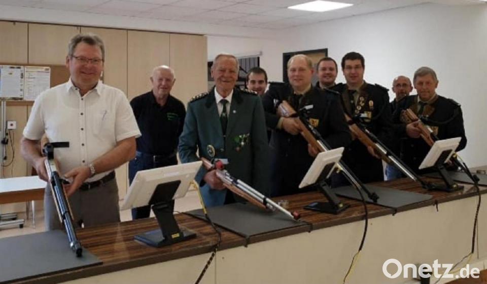Bürgermeister Martin Prey, Gauschützenmeister Manfred Muck und ein Teil der Schützenvorstandschaft legten an: Sie gaben die neuen elektronischen Stände der Pertolzhofener Schloßfalken für das Preis-Schießen frei.