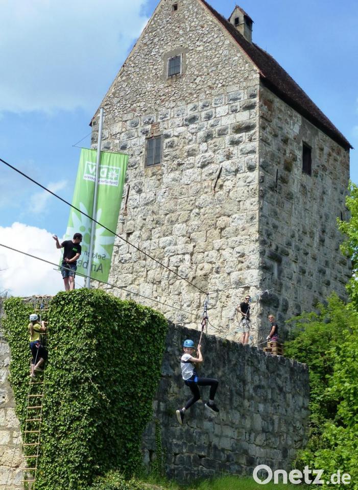 Um auch die Kinder der Besucher stilgerecht beschäftigen zu können, hatte die Alpenvereins-Jugend eine Seilstrecke von der Burgmauer bis zum Burggraben aufgebaut, die eine Herausforderung an die Geschicklichkeit der jungen Besucher stellte. Und so war es ein ständiges Kommen und Gehen der Freunde des Amberger Alpenvereins bis zum späten Abend, wobei das Wetter hervorragend mitspielte.