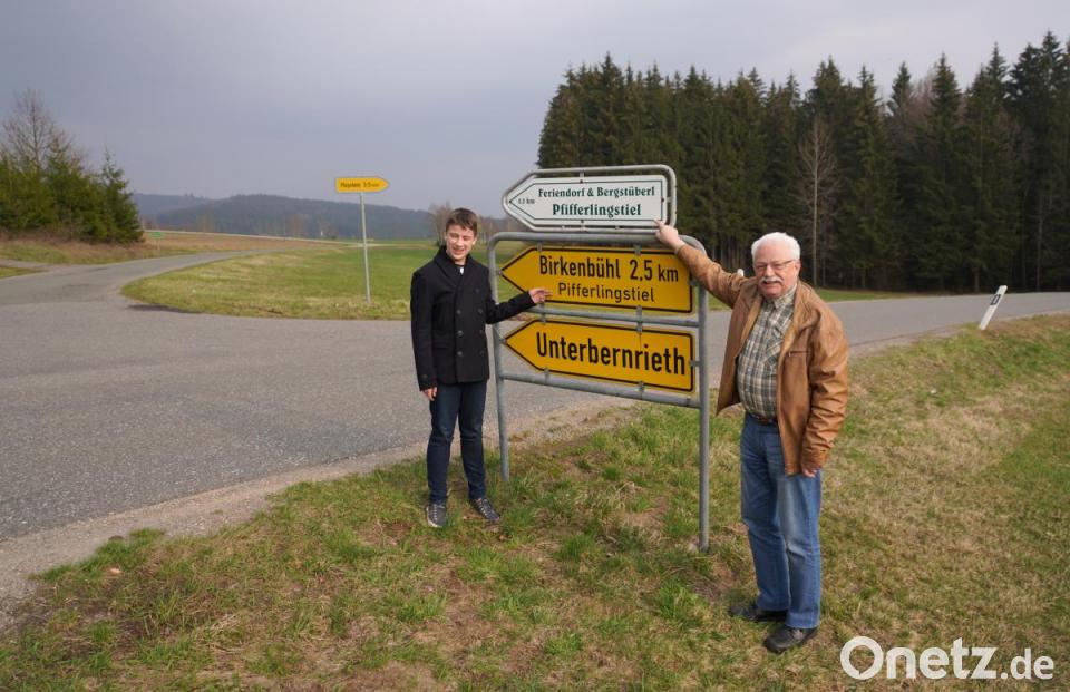 Der Oberbernriether Heimatpfleger Georg Schmidbauer ist in den vergangenen Jahrzehnten bestimmt schon 1000-mal auf der Verbindungsstraße von Oberbernrieth nach Pleystein gefahren. Genauso oft ist er auch an den Pfeilwegeweisern an der Stelle vorbeigekommen, die auf die Ortschaften Unterbernrieth, Birkenbühl und auch auf das Feriendorf Pfifferlingstiel hinweisen. „Seit vielen Jahren nehme ich den Wegweiser wahr, mein 14-jähriger Enkelsohn Georg Schmidbauer junior hat mich jetzt darauf hingewiesen, dass hier was nicht stimmt“, erklärte Schmidbauer senior nach einem Spaziergang. Der junge Mann wies seinen Opa darauf hin, dass mit dem Namen „Pfifferlingstiel“ am Wegweiser etwas nicht in Ordnung sei. Nach genauerem Hinsehen mussten die Schmidbauers feststellen, dass im Namen „Pifferlingstiel“ ein kleines „f“ fehlt, das anscheinend die letzten Jahrzehnten niemand aufgefallen ist.