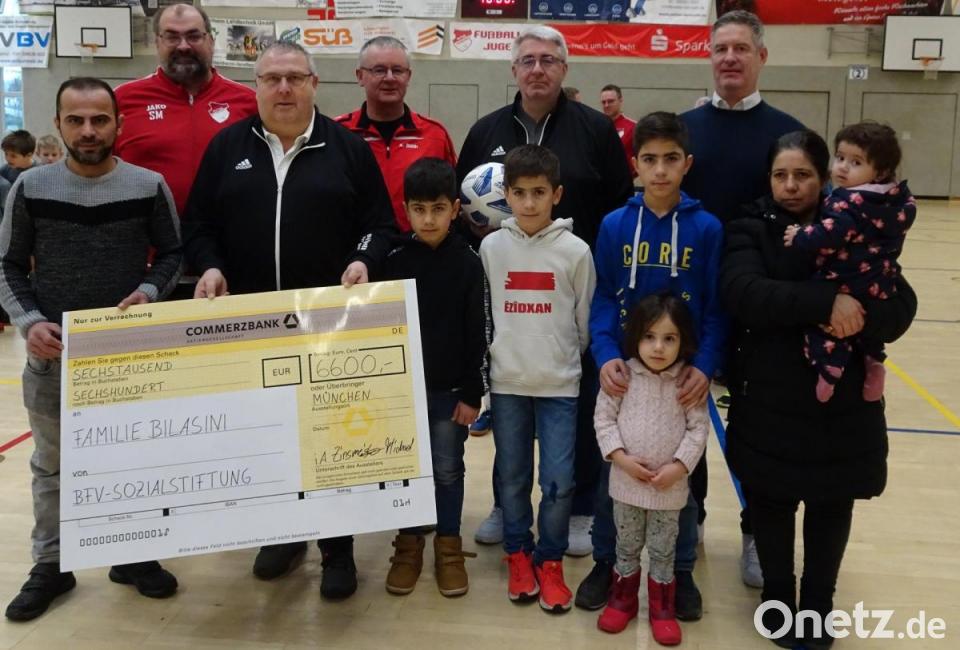 Der Spartenleitung war es ein wichtiges Anliegen, der Familie jedwede Unterstützung zukommen zu lassen. Hier kam nun die BFV-Sozialstiftung ins Spiel, die seit 2012 Menschen, die in Not geraten sind, unterstützt. Das Hallenspektakel der SpVgg Pfreimd am Samstag in der Landgraf-Ulrich-Halle bot den würdigen Rahmen für die Übergabe einer Spende in Höhe von 6600 Euro an die Familie Bilasini durch Werner Mages und Thomas Graml vom BFV. Mit der Spende lässt sich die geplante Beseitigung des Brandschadens und die Fertigstellung der Sanierungsarbeiten des Hauses der Familie Bilasini bis April realisieren.