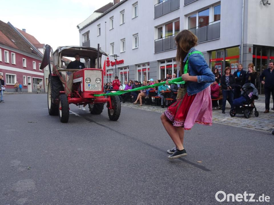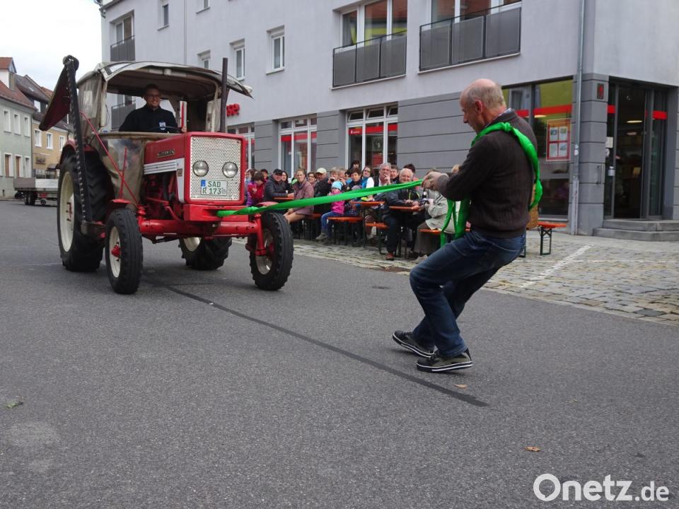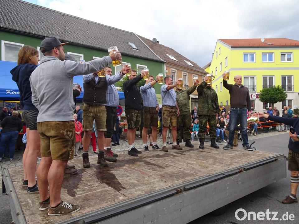 Inzwischen bereits zum 15. Mal hatte der Kirwaverein auf dem Marktplatz zum „Pfreimder Kirwa-Wettkampf“ eingeladen und zog damit am Kirchweihmontag erneut zahlreiche Besucher an. Zünftig spielten Vitus an der Quetschn und seine Mitstreiter zur Unterhaltung auf. Dem Aufruf des Kirwavereins folgten zehn Männer und eine Frau, die zum gegenseitigen Wettkampf in den fünf Disziplinen Traktorziehen, Bierkistl-Lauf, Schätzfrage, Bierkrug-Schieben sowie Maßkrugstemmen antraten. Unter ihnen stellten sich auch Soldaten aus der Oberpfalzkaserne, die wieder zahlreich auf dem Marktplatz vertreten waren, dem ungewöhnlichen Wettbewerb. Es galt, sowohl Kraft wie auch Durchhaltevermögen und Geschicklichkeit unter Beweis zu stellen.