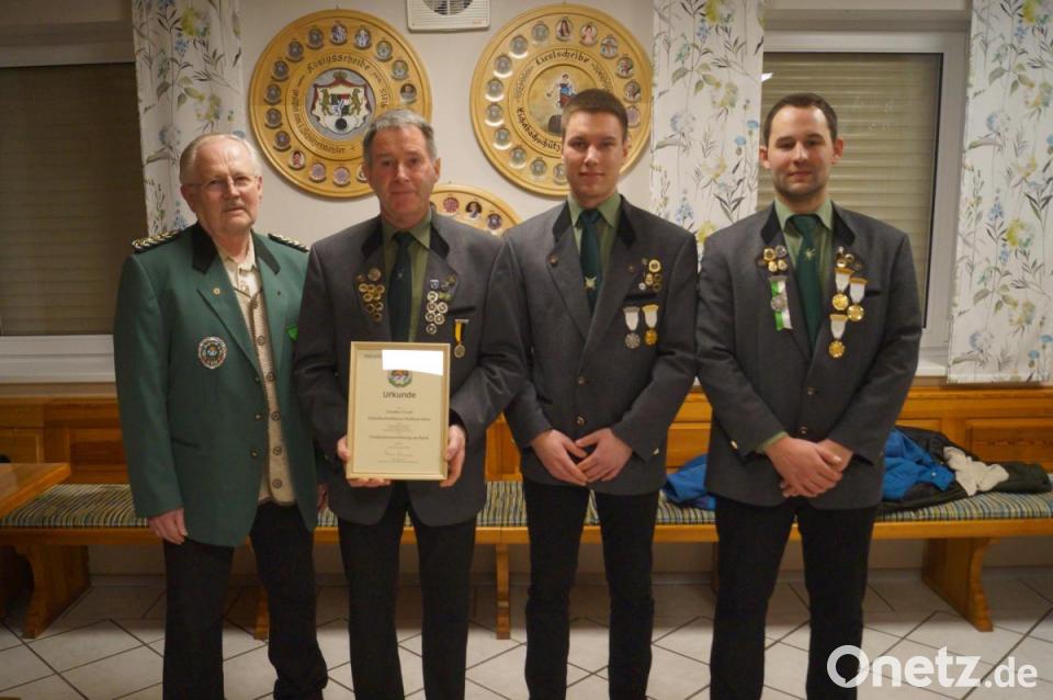 Bei der Jahreshauptversammlung der Eichelbachschützen Weihern-Stein konnte der Gauschützenmeister des Schützengau Nabburg, Johann Dirrigl, eine besondere Ehrung vornehmen. Dem langjährigen Sportleiter der Eichelbachschützen, Günther Gradl, konnte für seine Mitarbeit im Schützenwesen des Oberpfälzer Schützenbundes e.V. die Verdienstauszeichnung am Band verliehen werden. Dazu erhielt der Geehrte die Urkunde, die vom Präsidenten des Oberpfälzer Schützenbundes Franz Brunner unterschrieben wurde.