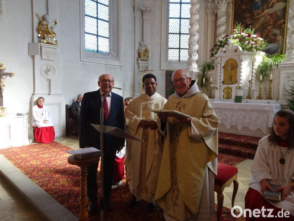 Gemeinsam mit Stadtpfarrer Pater Georg Parambilthadathil stand der 86-jährige Franziskaner beim Hauptgottesdienst in der Stadtpfarrkirche am Altar und dankte Gott für seinen Schutz und die göttliche Wegbegleitung während der sechs Jahrzehnte priesterlichen Wirkens. Es war Pater Dagobert ein Anliegen, das Jubiläum an all seinen Wirkungsstätten zu feiern, so auch in Pfreimd. In der Pfarrei Pfreimd war der Ordensmann sechs Jahre lang – von 1978 bis 1984 – als Kaplan tätig. In dieser Zeit hatte er zwei Jahre lang auch das Amt des Präses der Kolpingsfamilie inne. Die Glück- und Segenswünsche der Pfarrei überbrachte am Ende des Gottesdienstes Pfarrgemeinderatssprecher Klaus Summer, der an den unermüdlichen Dienst in der Seelsorge und an viele humorvolle Begegnungen mit dem Franziskanerpater erinnerte.