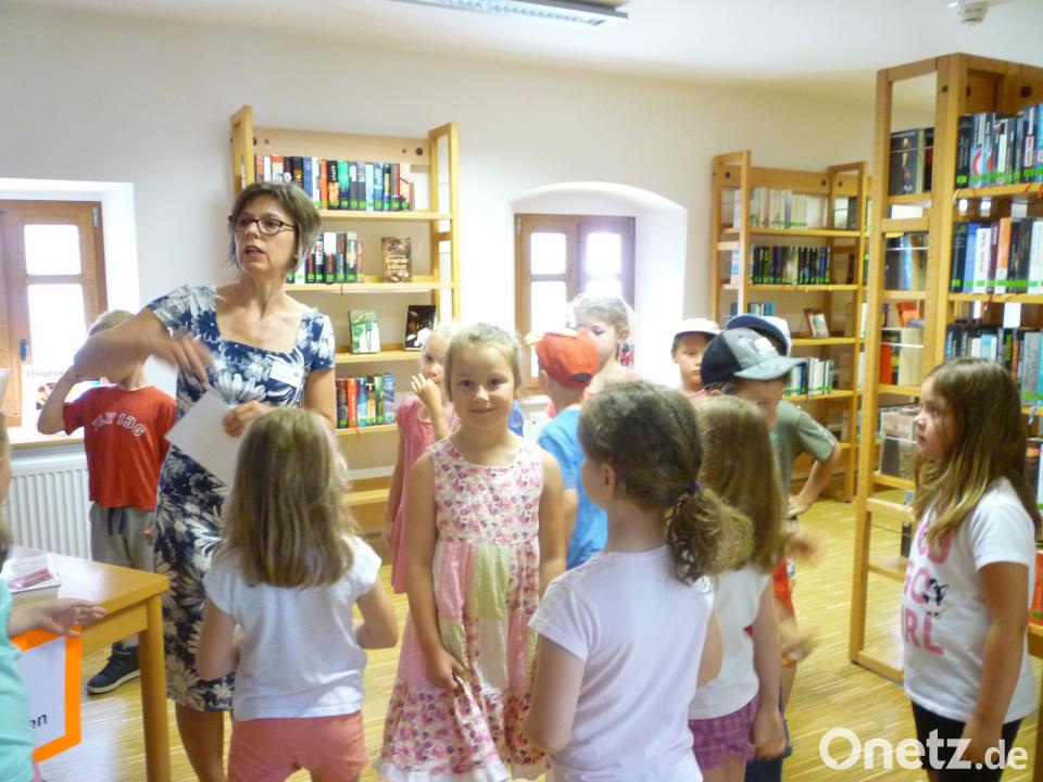 Irmgard Sittl, eine der zahlreichen ehrenamtlichen Mitarbeiterinnen der Stadtbücherei, nahm die Kinder unter ihre Fittiche und erklärte ihnen den historischen Hintergrund der Räumlichkeiten. Sie führte durch jeden Raum und wies auf die jeweiligen farbig markierten Altersstufen für die Leser hin.