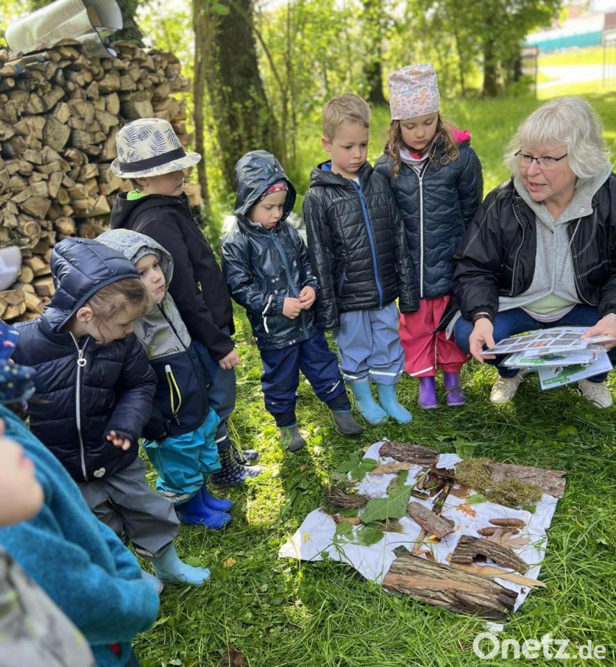 Im Rahmen der Naturbegegnungstage besuchte Bärbel Probst vom Bund Naturschutz die Kinder des Franziskus Kindergarten mit Krippe in Pfreimd. Albert Sittl stellte dafür sein Grundstück mit viel Baumbestand als "Anschauungsobjekt" zur Verfügung.