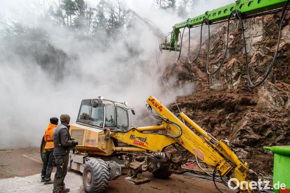 Die weiß-graue Staubfahne ist weithin zu sehen. Maschinen dröhnen. An einer langen, grünen Lafette hängt ein Pressluft-Bohrgerät, hämmert und bohrt einen Meißel in luftiger Höhe in den Fels. Bis zu sechs Meter tief. „Imloch-Hammer-Verfahren“ heißt die Technik, die das Spezialtiefbau- Unternehmen Schönberger aus Zenting (Kreis Freyung-Grafenau) an der Staatsstraße 2657 anwendet. Bei Streckenkontrollen hatte das Staatliche Bauamt festgestellt, dass hier am Wenzel Felssturz und Steinschlag drohen. Deshalb wurde die Sicherung angeordnet. Rund 300 Löcher werden gebohrt, jedes neun Zentimeter im Durchmesser. In sie werden schließlich 28 Millimeter dicke Stahlstangen mit Gewinde eingebracht und mit Zement eingegossen. Die Anker reichen drei bis sechs Meter in den Fels, erläuterte Bauleiter Christian Haslinger den Oberpfalz-Medien.