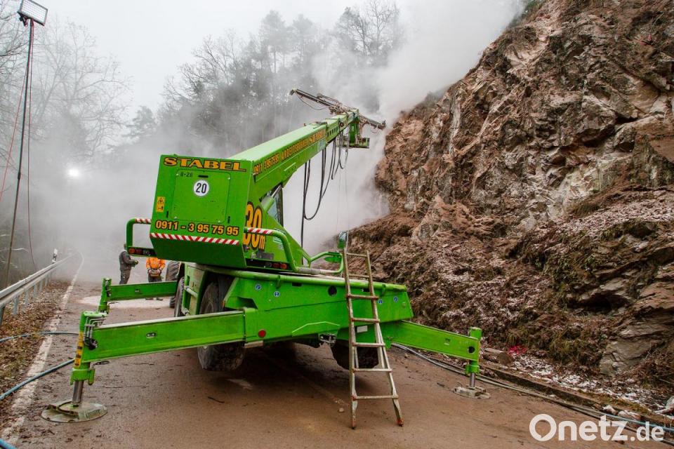 An den Gewindestangen wird mit Krallplatten und großen Muttern schließlich die eigentliche Fels-Sicherung verspannt: Ein Geflecht aus drei Millimeter dicken Stahldrähten wird lose Steine aufhalten. Oben an der Kante wird das Netz wie ein Zaun etwa einen Meter überstehen. Das dient dann auch als Absturzsicherung für Wanderer. Bis zur Straße hinunter sind es immerhin bis zu 18 Meter. Teilweise werden am Hang auch einzelne Brocken mit Gurten gesichert. Beim Einbringen der Stahlanker ist Sorgfalt gefragt, Abstandshalter halten sie in der Mitte der Löcher, damit die rundherum von Zement eingeschlossen werden. Das verhindert Rost. Bislang laufe alles nach Plan, erläutert Haslinger, der mit seinem Trupp in ganz Deutschland unterwegs ist. Immer dann, wenn auf Weinbergen, an Bahnstrecken oder Straßen Böschungen oder Felsen gesichert werden müssen. Bis zum 20. Dezember werden die Männer noch hier arbeiten, dann ist erst einmal Weihnachtspause. Ab Mitte Januar kommt dann das Netz an Ort und Stelle. Die Kosten für die Absicherung betragen laut Lisa Waitz vom Staatlichen Bauamt Amberg-Sulzbach rund 150000 Euro. Die Straße zwischen Pfreimd und Wernberg-Köblitz bleibt noch bis zum 20.Dezember gesperrt. Der Verkehr wird über Weihern umgeleitet.