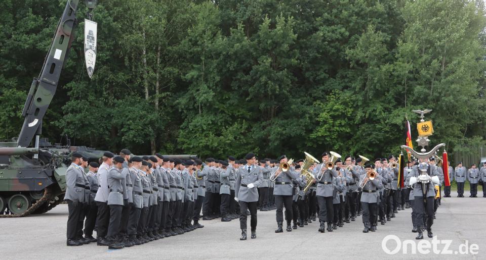 Höhepunkt des Verabschiedungs- und Übergangerituals war ein öffentlicher Appell, der am Nachmittag in der Kaserne über die Bühne ging. Dass es ein Mittwoch war, hatte mit dem Heeresmusikkorps Ulm zu tun, das beim Appell für die Musik sorgte - es hatte an keinem anderen Tag Zeit, nach Pfreimd zu kommen. Die Musiker spielten Stücke wie den "Regimentsgruß", "Des Großen Kurfürsten Reitermarsch" und ähnliches, wobei das Programm am Ende in Bayernlied und Nationalhymne mündete, die dann auch die nicht-uniformierten Gäste der Veranstaltung kannten.