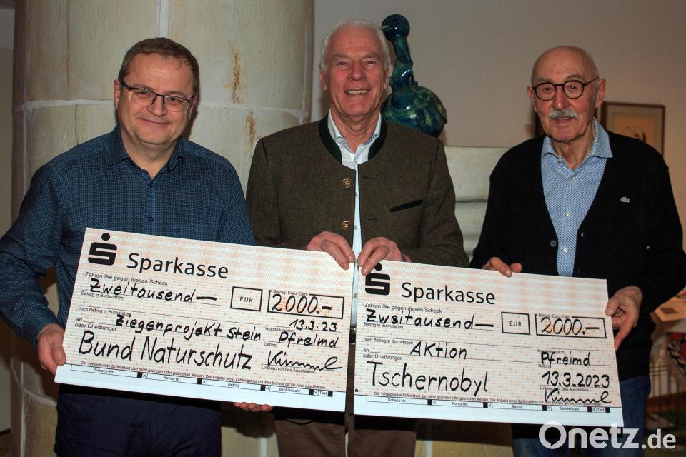 Altbürgermeister Arnold Kimmerl feierte seinen 75. Geburtstag und wollte mit dieser Feier nicht nur sich und seinen Gästen etwas Gutes tun. Statt Geschenken bat er um Geldspenden und überreichte sie nun an zwei Vereine, die ihm wichtig sind: Jeweils 2000 Euro nahmen Dr. Josef Ziegler für die Aktion Tschernobyl und Gottfried Blank für die Ortsgruppe Pfreimd vom Bund Naturschutz entgegen. Arnold Kimmerl freute sich über den stolzen Betrag von 4000 Euro, den er dank seiner Gäste übergeben konnte. Der Altbürgermeister wünschte sich, dass die beiden Vereine ihre Arbeit in der bisherigen Weise weiterführen können.