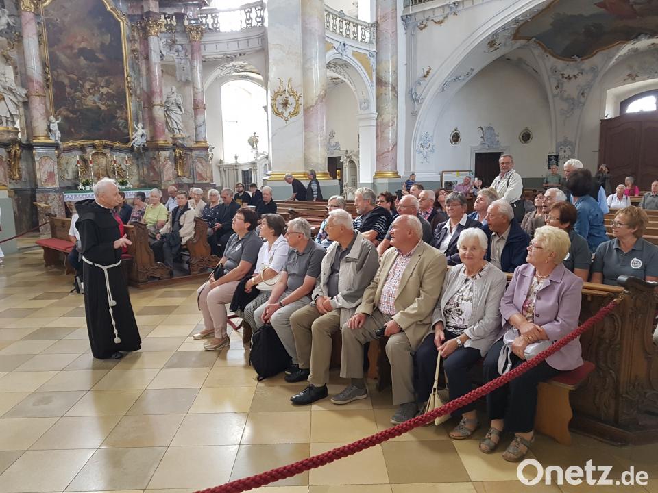 Für die Pfarrei Pfreimd übergaben Kirchenpfleger Karl Hirmer und für die Kolpingsfamilie der Vorsitzende Georg Hirmer jeweils ein Geldgeschenk, welches in die Entwicklungshilfe in Bolivien fließt. Für die Stadt gratulierte Bürgermeister Richard Tischler postalisch, da er bei der Feier verhindert war. Nach dem Mittagessen nahm sich Pater Bernhard für seine Pfreimder extra Zeit, um die Pilgergruppe durch die wunderschöne Basilika zu führen. Anschließend war noch Gelegenheit für persönliche Gespräche. Hier äußerte sich der Franziskanerpater besorgt über den Rückgang des Kirchenbesuchs. "Viele Menschen leben heute sehr oberflächlich und fragen nicht nach dem Sinn des Lebens", stellte er fest. Früher vertröstete man die Menschen auf das Jenseits, heute lebten viele nur im Diesseits, der Mittelweg wäre das Beste. "Früher lebten die Menschen 40 Jahre plus Ewigkeit, heute nur noch 90 Jahre", zitierte er den Pastoraltheologen Zulehner.
