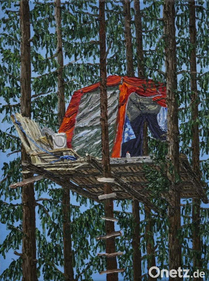 Im Hambacher Forst hat die Künstlerin neben der Natur auch Relikte der Besucher in ihre Bilderwelt aufgenommen und dabei vor allem die kompositorische Seite berücksichtigt. Was da an Bauwerken in den Bäumen entstanden ist, hat sie ein wenig an Vogelhäuschen erinnert. Nicht wenige ihrer Bilder sind in Winklarn und Umgebung entstanden, fündig wurde die 37-Jährige bei der Suche nach Motiven beispielsweise in Gleiritsch und Tännesberg.
