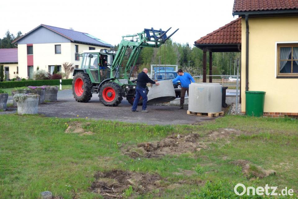 Vorsitzender Ewald Zetzl konnte zum Beginn der ersten Arbeiten an der im Untergrund geplanten Wasserzisterne auf die Hilfe von Fabian Forster und Hubert Wildenauer vertrauen. Für das Anliefern der schweren Beton-Fertigteile zur befestigten Parkfläche vor dem Schützenhaus genügten deshalb Anhänger und Frontlader. Dadurch kann vor Ort Maß genommen werden, um für die erforderlichen Grabungsarbeiten ausreichend Erdmaterial auszuheben. Erst wenn die Fundamentarbeiten abgeschlossen sind, können die ehrenamtlichen Helfer das Aufsetzen des neuen Brunnens in Angriff nehmen. Dazu wird nochmals ein Spezialkran benötigt. Bis dahin ist es aber noch ein weiter Weg, der aber nicht nur für Zetzl „nunmehr überschaubar“ ist.