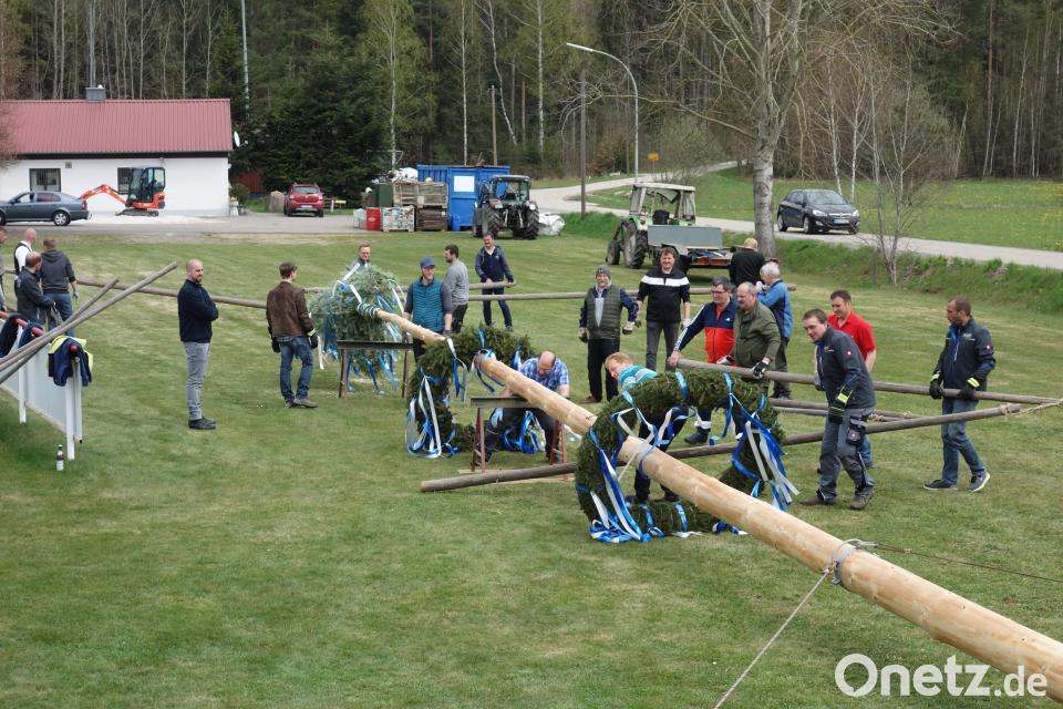 Zu den Hebezügen der Helfer gesellten sich immer wieder die Laute von zwei Ratschen. Denn an Traktoren befestigte Stahlseile sicherten eine fachmännische Errichtung. Viele junge Familien ließen sich das Geschehen ebensowenig entgehen, wie Bürgermeister Markus Bauriedl, der auch die anderen Maibaumfeste in Waidhaus, Hagendorf und Reichenau nicht versäumte.