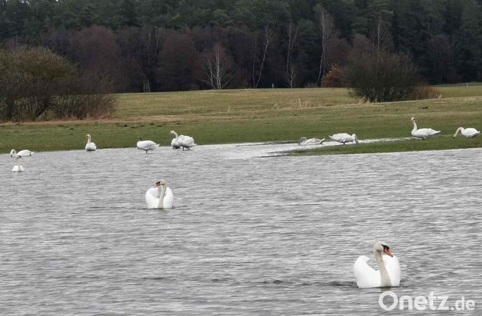 In der Überschwemmungszone bei Pfrentsch versammelten sich kürzlich sozusagen zum Mittagstisch gleich zwölf strahlend weiße Höckerschwäne. Die Schwäne gründelten mit Untertauchen von Kopf und Hals am Boden des flachen Wiesengeländes nach Wasserpflanzen und bereicherten mit ihrem majestätischen Aussehen das überschwemmte Gelände.