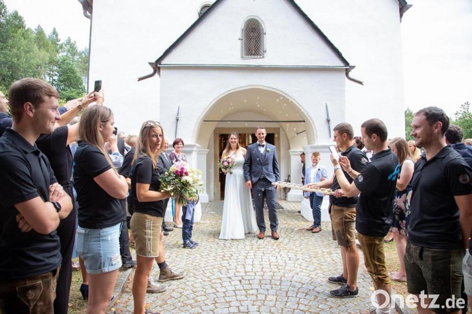 Die musikalische Gestaltung der Trauung übernahmen die Freundinnen Julia und Lena Braun mit Gesang. Nach der Trauung durschschritt das Paaar ein Spalier aus Vereinsvertretern. Das waren: die Plassenberg-Schützen Gleiritsch, der Kirwaverein Gleiritsch, die KLJB Gleiritsch, die Fußballer des TSV Tännesberg, die DJK-Damengymnastik sowie Arbeitskollegen. Zum Feiern ging es mit fast 100 Gästen im Oldtimer von Auto Burger in die Mühlschleife nach Niederland, wo die Band „HOAß“ zünftig aufspielte.