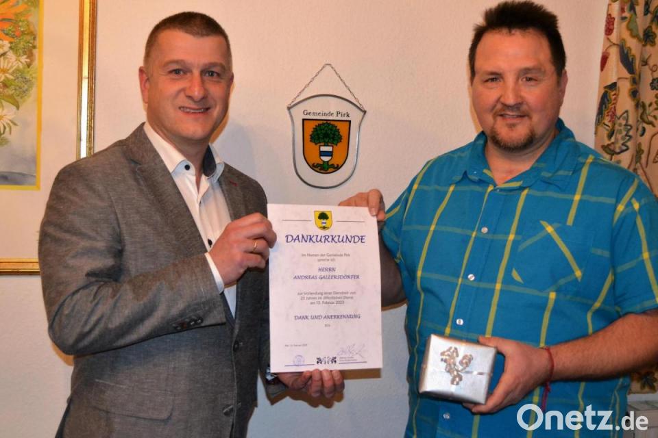 Für einen "Einsatz" der besonderen Art hatte Andreas Gallersdörfer kürzlich seine orange Bauhofkleidung gegen ein schickes Hemd getauscht. Bürgermeister Dietmar Schaller hatte ihn ins Rathaus geladen, um ihn für 25 Jahre Dienst in der Gemeinde zu ehren.