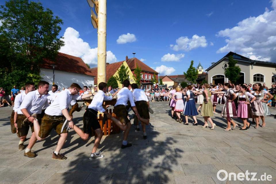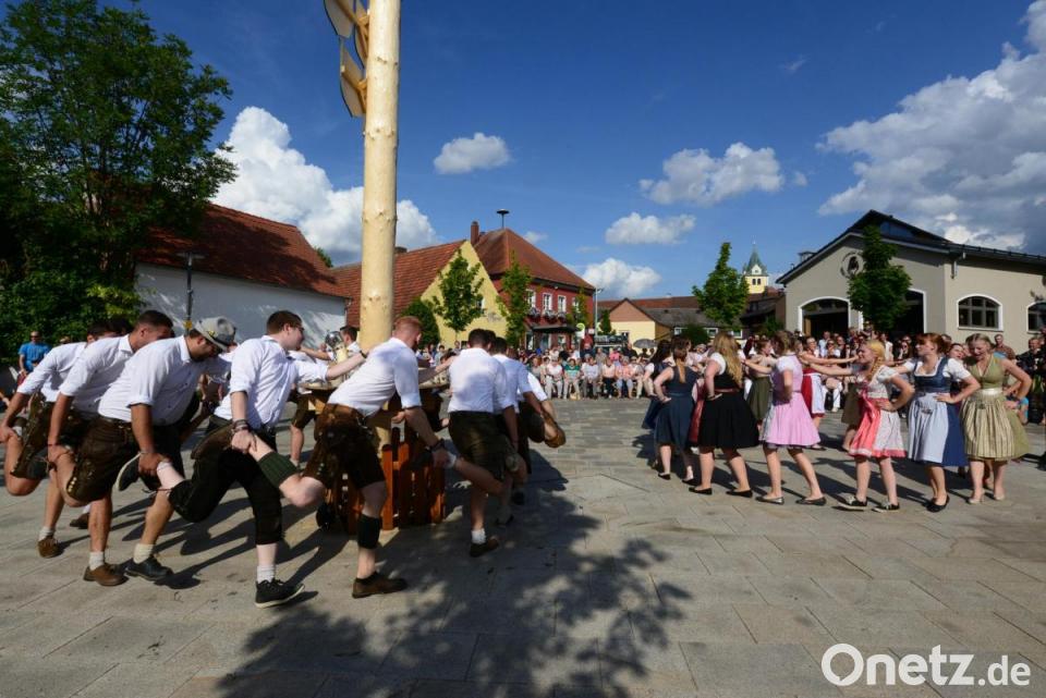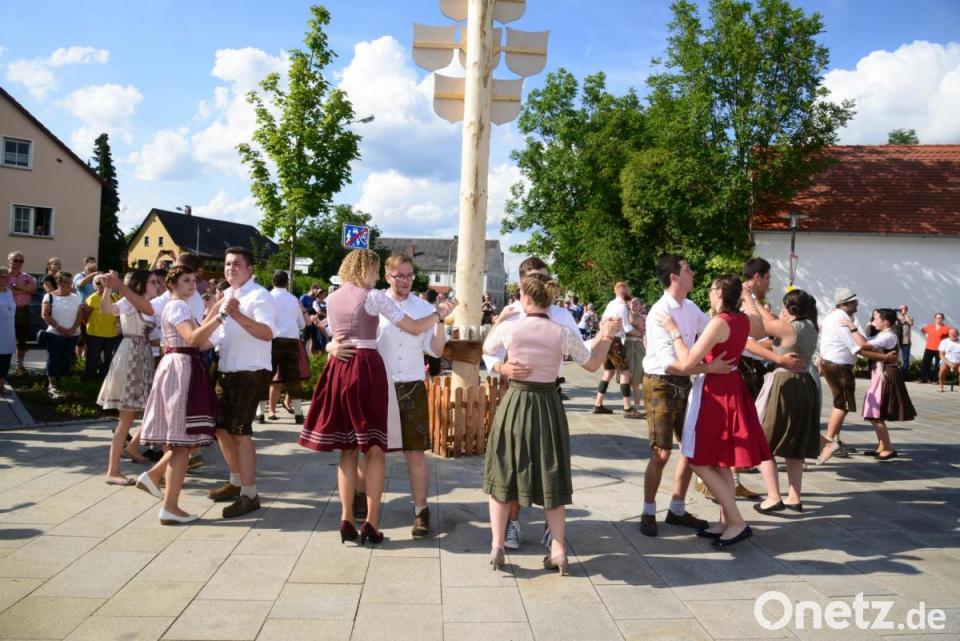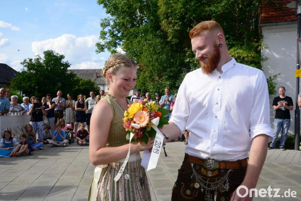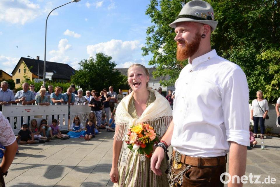 Noch lange bevor die Kirwatanzpaare nach ihrem kurzen Marsch vom Festzelt am Dorfplatz einmarschierten, wartete eine große Besucherzahl bei wunderbarem Sonnenschein auf den bunten Auftritt. Der Kirchweihbaum war natürlich der Mittelpunkt aller Tänze, bei der heiß erwarteten Bekanntgabe des neuen Oberkirwapaares und bei der Einstimmung durch die „Goaßlschnalzer“. Doch bis das neue Oberkirwapaar Johanna Kick und Raphael Landgraf seinen „Glücksbringenden“ Blumenstrauß in Händen hielt, hieß es für die Tanzpaare noch viele Tanzrunden um den Kirwabaum zu drehen. Der Kirwabaum fand per Verlosung einen neuen Eigentümer.