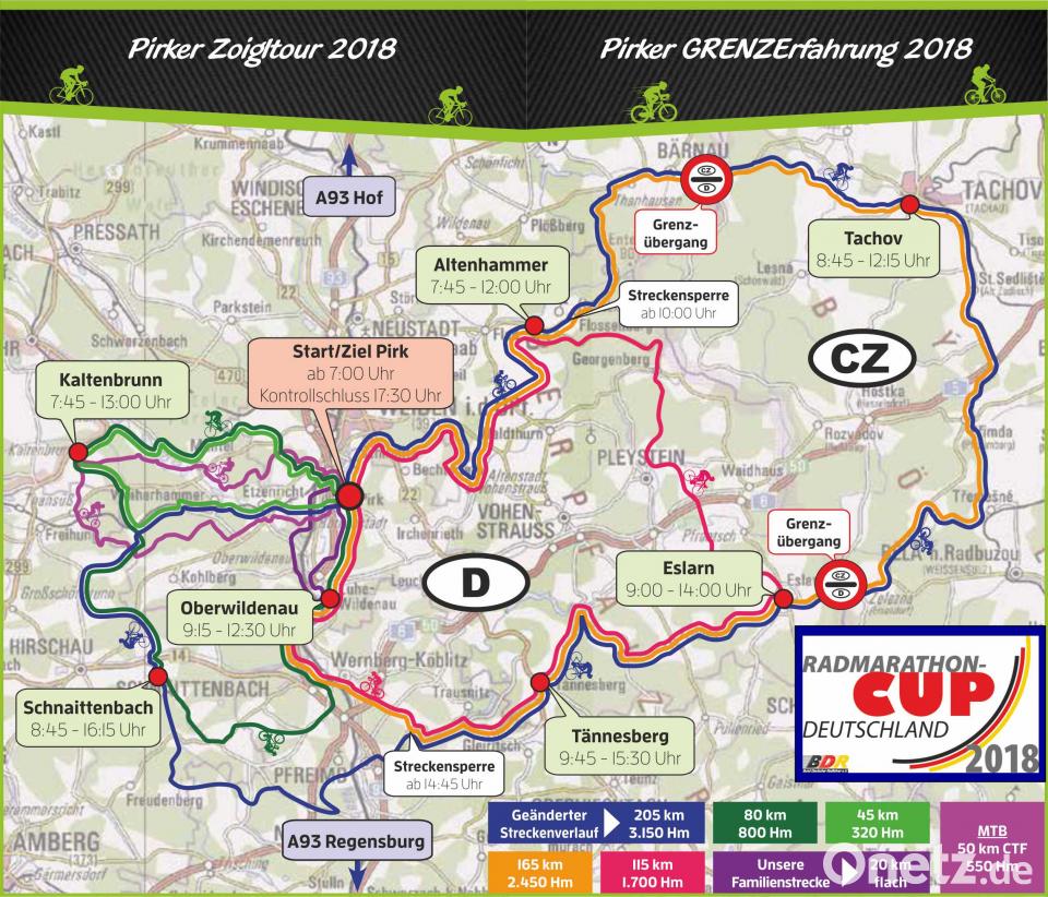 Sieben Strecken für jeden Anspruch hat die Concordia im Angebot: die Familienstrecke über 20 Kilometernach Luhe-Wildenau und zurück, dann die 45 Kilometernach Kaltenbrunn und zurück, die50 KilometerMountainbike-Strecke, die über auf Wald- und Feldwegen nach Kaltenbrunn und zurück verläuft, die 80 Kilometerüber Wernberg, Kemnath am Buchberg, Schnaittenbach, Kaltenbrunn, Mantel und zurück, die 115 Kilometernach Altenhammer, Eslarn, Tännesberg, Wernberg und zurück, die 165 Kilometerüber Flossenbürg, Bärnau, nach Tachov (Tschechien), Eslarn, Tännesberg, Wernberg und zurück und dann eben die 205 Kilometermit der gleichen Strecke wie die 165 Kilometer bis Tännesberg, dann von hier jedoch nach Pfreimd, Kemnath am Buchberg, Schnaittenbach und zurück ins Ziel.