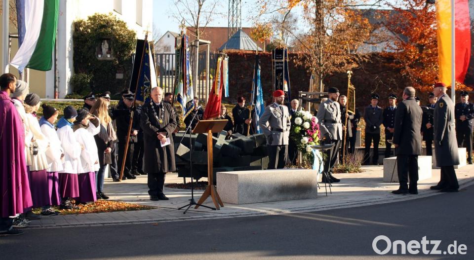 "Hätte man nicht hoffen können nach der Katastrophe des Ersten Weltkrieges, dass die Menschheit lernt. Leider war die Ruhe nach dem Sturm, die Ruhe vor dem Sturm." Nun fordert dieser Tag den Toten zu gedenken - den aktuellen kriegerischen Auseinandersetzungen ebenso wie der Zivilbevölkerung. Schülerin Jana List von der Josef-Faltenbacher-Schule brachte ihre Friedensgedanken zum Volkstrauertag vor: "Damit es Frieden in der Welt gibt, müssen Völker in Frieden leben. Damit es Frieden gibt, dürfen sich die Länder nicht gegeneinander erheben. Damit es Frieden in den Ländern gibt, müssen sich die Nachbarn verstehen, wir müssen heute schon vorbereiten, was wir für den Frieden tun können." Für die Soldatenkameradschaft trugen Vorsitzender Mario Hönig und für die Gemeinde Gemeinderat Martin List einen Kranz und legten ihn am Mahnmal, an dem zwei Bundeswehrsoldaten Wache standen, nieder. Drei Böller krachten, während die Blaskapelle "Ich hatt' einen Kameraden" spielte.
