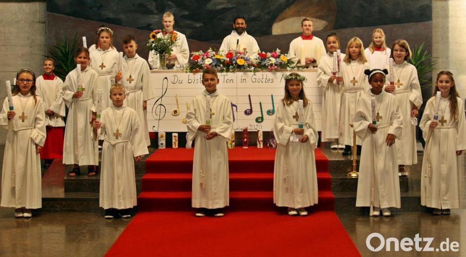 Zusammen mit Pater Jaison Thomas hatten sechs Tischmütter zwölf Kinder auf die Erstkommunion vorbereitet. Das Motto: Du bist ein Ton in Gottes Melodie. Die Feier fand nur mit engen Angehörigen der Erstkommunionkinder statt. Die Gottesdienst war liebevoll gestaltet. Zum „Vater unser“ kamen alle Kommunionkinder zum Altar.