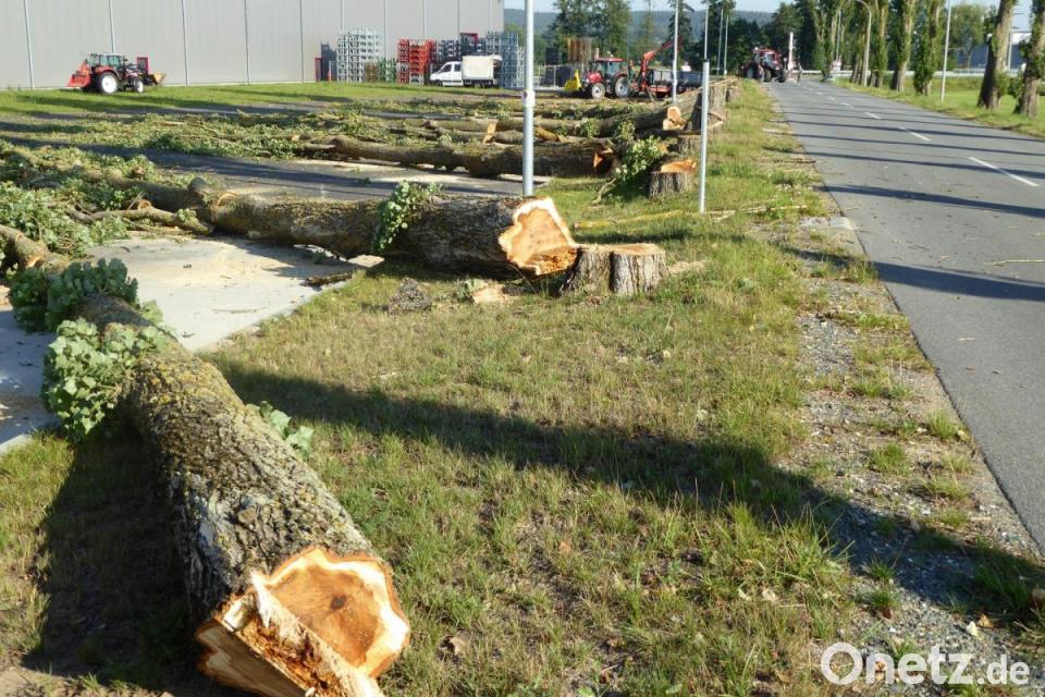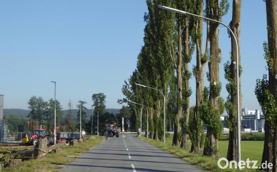 Nach dem Bau einer neuen Logistikhalle mit Verlagerung des Sportgeländes ab 2017 musste eine Wasserleitung wieder auf Gemeindegrund verlegt werden. Da der notwendige Platz zwischen Straße und Grundstück sehr beengt war, mussten dabei einige große Wurzeln der Säulenpappeln an der Seite zur Halle hin abgetrennt werden. In Folge starben drei Bäume völlig ab und einige weitere wurden massiv beschädigt. Landschaftsarchitekt Gottfried Blank empfahl deshalb und auch wegen möglicher Gefahren bei Unwettern das Entfernen der in Mitleidenschaft gezogenen Bäume. Die Untere Naturschutzbehörde forderte eine Ersatzpflanzung sowie ein Pflanz- und Pflegekonzept.