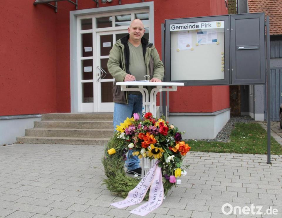 Ein Trauerkranz, der durch Bayern zieht, hat den Ort Pirk erreicht. Doch bis München ist es noch ein weiter Weg. Bastian Sollfrank, Gastwirt des Lokals "Auszeit", unterstützt diese Aktion, holte das Blumengebinde in Weiden bei der Firma CT-Creativ ab und brachte es am nächsten Tag zu weiteren Betrieben in der Stadt. Am Samstagnachmittag legte er gemeinsam mit Bürgermeister Dietmar Schaller den Kranz vor dem Rathaus nieder. Dieser ist mit bunten künstlichen Blumen geschmückt und auf seinen Schleifen mit dem Schriftzug "In stillem Gedenken an alle Unternehmen, für die der Lockdown zum Knockout wurde" versehen. Sowohl Gastronom Sollfrank als auch Christos Kyrkos, Pächter der künftigen "Gaststätte Bonaublick" im Sportpark, trugen sich in einen Kondolenzordner ein, in den auch ein Schreiben mit den Sorgen, Ängsten und Forderungen der Unterzeichner abgeheftet werden kann. Er soll schließlich zusammen mit dem Trauerkranz am Ende von dessen Reise am Maximilianeum niedergelegt werden.