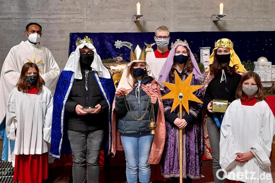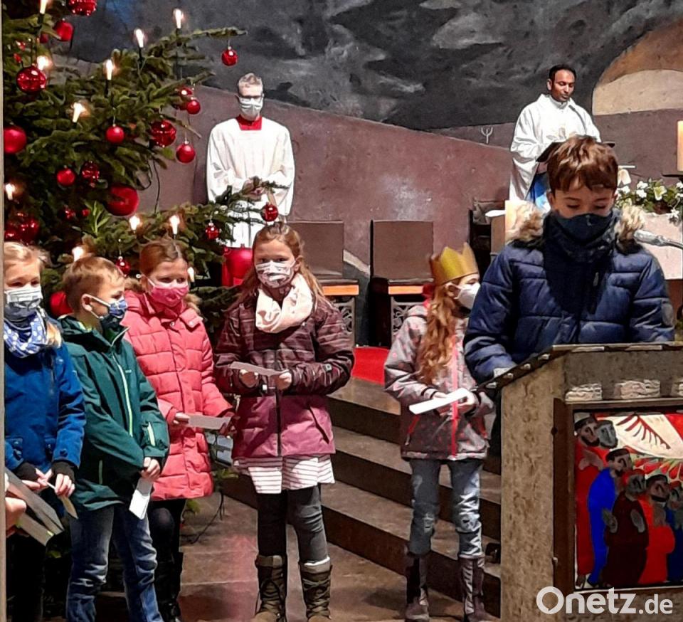Der Gottesdienst war zweiteilig angelegt. Zu Beginn zogen unter den Klängen der Bläsergruppe der "Blechfrösch" Pfarrer Jaison Thomas, die Ministranten und eine kleine Abordnung der Sternsinger feierlich in die Kirche ein. Die Sternsinger legten symbolisch ihre Gaben an der Krippe ab. In der Lesung wurde ein Filmausschnitt der Sternsingeraktion gezeigt, so dass die Gottesdienstbesucher erfuhren, wohin die Spendengelder dieses Jahr gehen, nämlich in die Ukraine. Dort leben viele Kinder ohne ihre Eltern, da diese im Ausland arbeiten müssen, um die Familien zu ernähren. Außerdem herrscht immer noch Krieg in diesem Land.