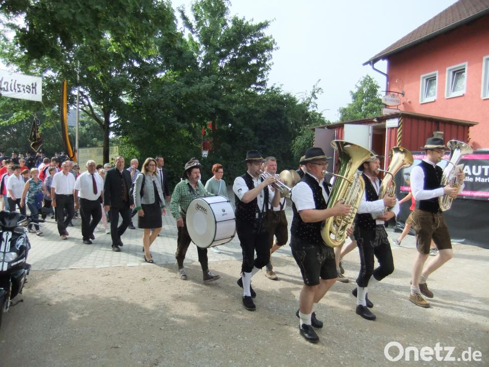 Schließlich lachte am Sonntag, dem Hauptfesttag, schon früh die Sonne vom Himmel. Der Festzug formierte sich in der Ortsmitte an der Marienkapelle mit vielen Vereinen zum Marsch ins Festzelt. Die Kapelle Blechrauschen führte mit schwungvoller Marschmusik und Vorsitzendem Hans Zimmermann den Zug an. Mit dabei war die 3. Bürgermeisterin der Stadt Schwandorf, Martina Engelhardt-Kopf, sowie der 2. Bürgermeister der Gemeinde Ebermannsdorf, Michael Götz. Die Pittersberger Böllerschützen ließen es dabei wieder einmal aus Anlass des Festtages krachen und rauchen.