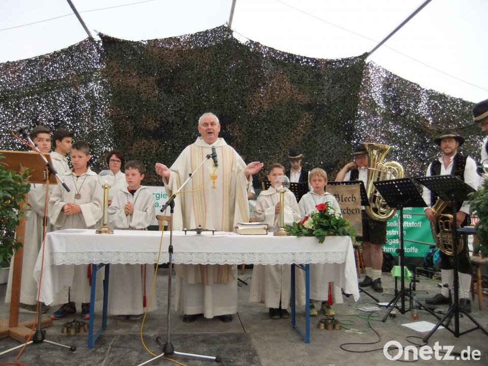 Im Festzelt wurde zusammen mit der Blaskapelle eine eigens dafür zusammengestellte Messe gesungen. Pfarrer Herbert Grosser verstand es, schon zu Beginn den Jubelverein und die Gottesdienst-Teilnehmer einzubinden, in dem er meinte: "Weltliches Fest, die Kirche sowie der Glaube an Gott gehören zusammen."