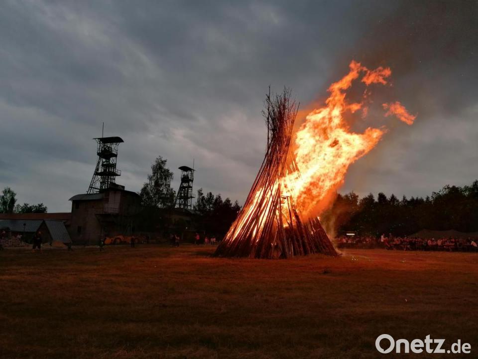 Lodernde Flammen vor Förderturm. Ein Stück Industriegeschichte und das Feuer des Johannisfeuers der KLJB Welluck-Nitzlbuch vereint auf einem Bild.