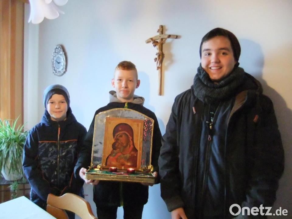 Die Messdiener Noah, Oliver und Tim (von links) mit dem hübsch geschmückten Marienbild bei einer Familie. Sie vollziehen den althergebrachten religiösen Brauch des Frauentragens zur Ehre Gottes.