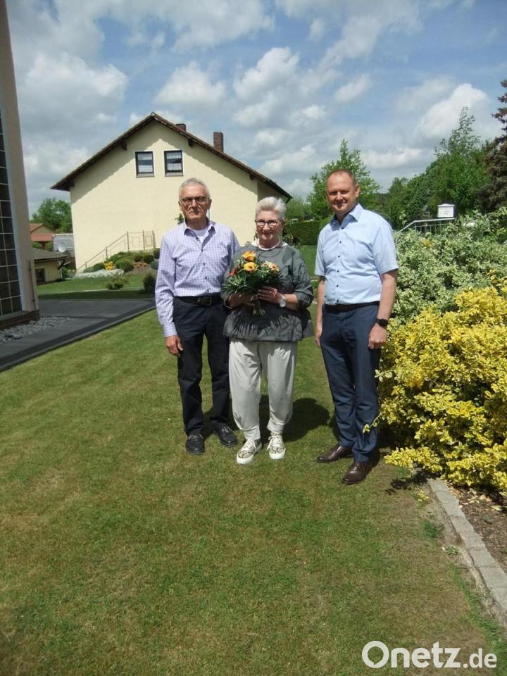 Anlässlich des Ehejubiläums schaute auch Bürgermeister Erich Meidinger beim Jubelpaar vorbei. Er überbrachte ein Präsent aus regionaler Produktion, verbunden mit dem Dank für die gute Zusammenarbeit in den zurückliegenden Jahren. Für die Pfarrei freute sich mit dem Paar Pfarrgemeinderatssprecherin Laura Damm.