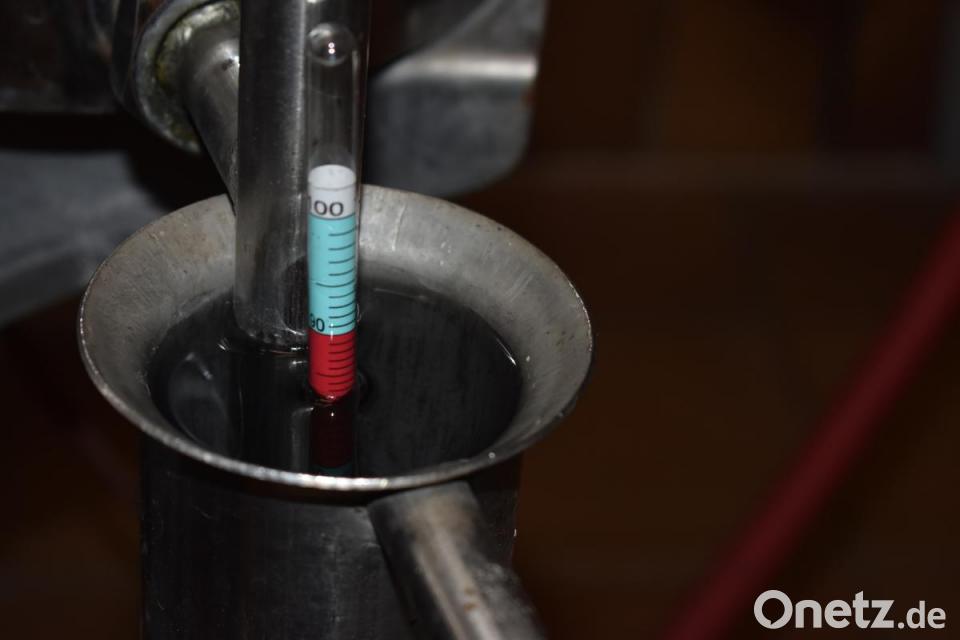 Über ein Messgerät beobachtet sie, wie der Alkoholgehalt langsam abnimmt. "Ab 80 Prozent kommt der Mittellauf. Das ist der Schnaps, den wir wollen." Der Alkohol fließt über einen Zulauf in einen Eimer. Birgit Schlötzer beobachtet das Geschehen. "Solange die Flüssigkeit im Zulauf klar ist, fangen wir sie ab. Danach ab etwa 50 Prozent wird sie trüb. Dann kommt nur noch Fusel. Der verursacht nur Kopfschmerzen."