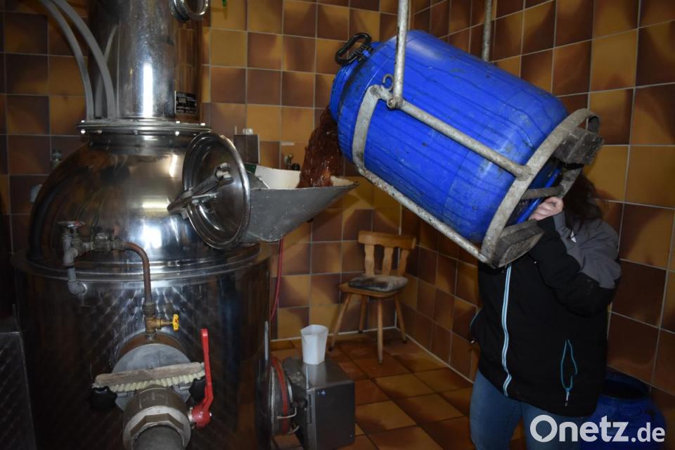 Mit einem Karren fährt Stefan Schlötzer mehrere blaue Fässer über seinen Bauernhof. Sein Weg führt ihn zu der Destille seiner Frau Birgit. "Sie kümmert sich um die Produktion, ich helfe ihr", sagt er. In einem kleinen Nebengebäude befindet sich ihre Obstbrennerei "Unter der Linde". Hinter den Verkaufsregalen befindet sich ein separater gefliester Raum mit dem Brenn-Apparat von Birgit Schlötzer. Dort breitet sich der süßliche Geruch von Zwetschgen aus. Über einen Schalter fährt die Expertin einen Aufzug herunter. Auf die Abstellfläche hebt sie mit ihrem Ehemann Stefan eines der Fässer. Ihr Inhalt: Rund 150 Liter Maische. Der Aufzug fährt ein Stück nach oben. Mit Schwung kippt die 50-Jährige das vergorene Obst in die Destille.