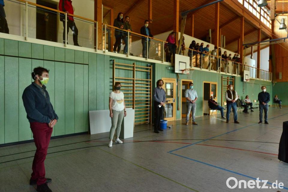 Fast über die halbe Seite der Turnhalle verteilt, standen die neuen StadträteThomas Gallitzendörfer, Christoph Müllhofer, Thomas Parton, Barbara Weig, Uli Weig und Thomas Weig, um den Eid zu sprechen. Anschließend gaben die Fraktionen ihre Sprecher bekannt. Josef Windirsch übernimmt diese Funktion bei der CSU, Stefan Voit ist sein Vertreter, Werner Rieß spricht für die gemeinsame Fraktion von SPD und FWG, Claudia Poxleitner ist seine Vertreterin.
