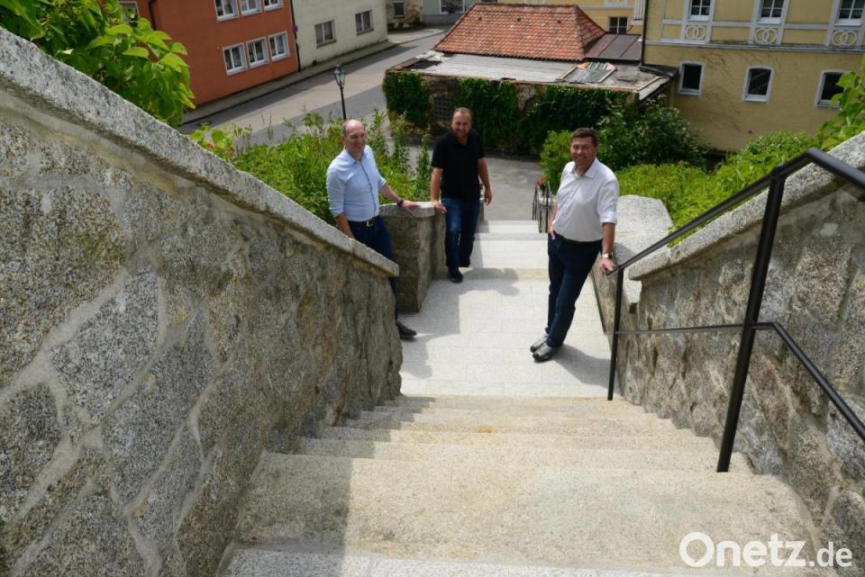 So wurde das Treppengeländer erneuert, dazu neue Geländerpfosten und neue Handläufe angebracht. Die Ausgaben dafür betrugen 18.028 Euro. Im Zuge der Sanierung des Treppenaufganges wurden elf neue Granitstufen gesetzt, die bestehenden, noch verwendbaren Stufen ausgerichtet und neu verfugt. Die seitliche Mauer wurde gereinigt und neu verfugt. Die Zwischenpodeste haben einen neuen Pflasterbelag auf Flossenbürger Granit erhalten. Die Kosten dafür beliefen sich auf 23.562 Euro.