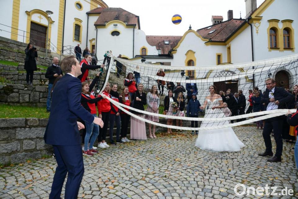 Die Abordnung des TSV Tännesberg in Mannschaftsstärke forderte das Paar zum Tore schießen auf, die Volleyballspielerinnen des TSV Pleystein spannten zuerst ein Netz über den Weg des Paares, dann war ein Ballwechsel auf dem Kreuzbergplateau angesagt. TSV-Vorsitzender Josef Windirsch, begleitet von 2. Vorsitzenden Sepp Hartung, überbrachte die Glückwünsche des Gesamtvereins, bei dem die Braut als Schriftführerin tätig ist.