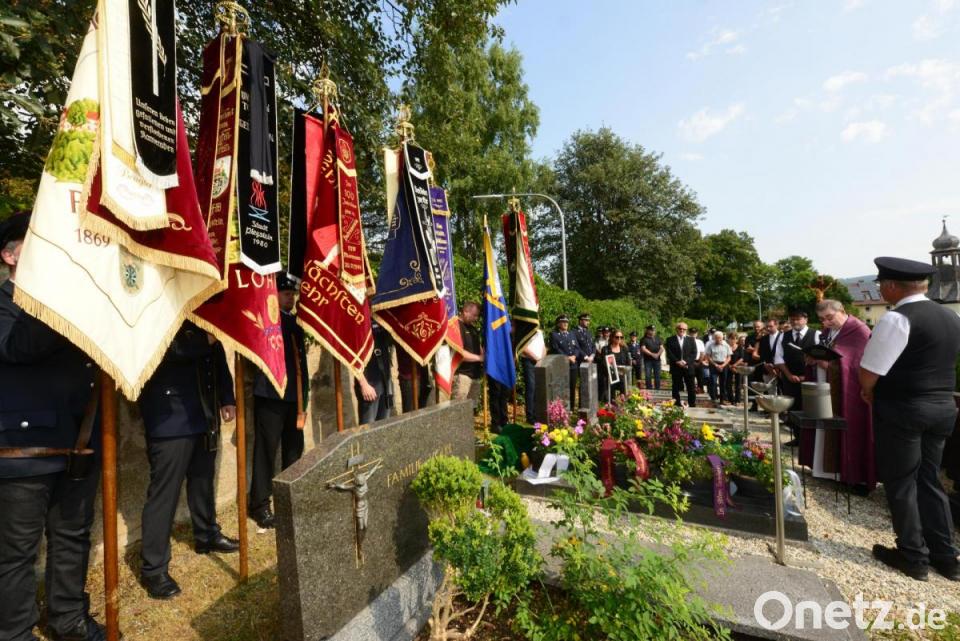 Sieben Fahnenabordnungen begleiteten den Trauerzug zum Friedhof. Dort wurde die Urne im Familiengrab beigesetzt. Der Männergesangverein 1895 verabschiedete seinen aktiven Sänger. Vorsitzender Karl Herrmann sprach nochmals Dankesworte an den Verstorbenen. Mit dem Trauerlied „Ich hatt´ einen Kameraden“, gespielt von der Stadtkapelle Pleystein, endete die Beisetzung.