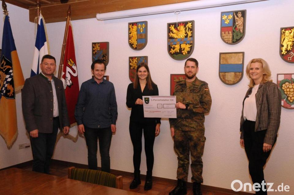 Kompaniechef Hauptmann Jens Girend übergibt Julia Beugler und Stefan Weig als Jugendbeauftragte der Stadt eine Spende in Höhe von 1.500 Euro für die Bildungsarbeit. Bürgermeister Rainer Rewitzer (links) und Zweite Bürgermeisterin Andrea Lang freuen sich über die großzügige Spende und sehen damit auch hervorragende Verbindung zwischen der Stadt Pleystein und der 5. Kompanie des Panzerbataillons 104.
