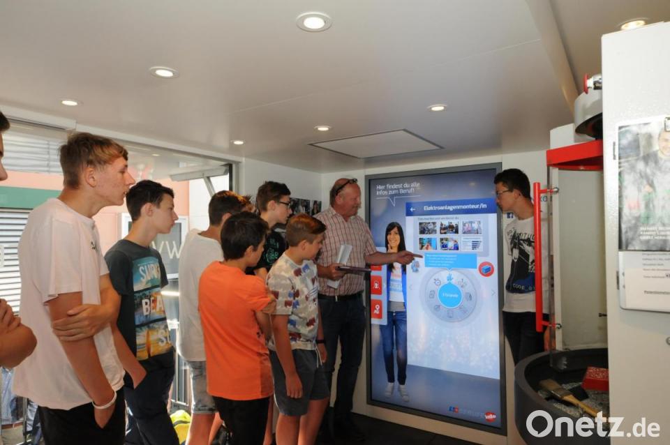 Beeindruckend für die jungen Gäste war der riesige Touch-Monitor, auf dem wichtige Inhalte zu den Metall- und Elektroberufen erklärt wurden, die aber zugleich auf einer Bayernkarte die Standorte entsprechender Firmen zeigten und, was für das künftige Leben späterer junger Arbeitnehmer bedeutend ist, die Verdienstmöglichkeiten präsentierten. Zita und Bieler wiwsen ausdrücklich darauf hin, dass die Lehrlingsvergütungen und auch der Lohn im ersten Berufsjahr sich auf die Tarife Nordrhein-Westfalens beziehen, weil die Beträge in Bayern höher sind.