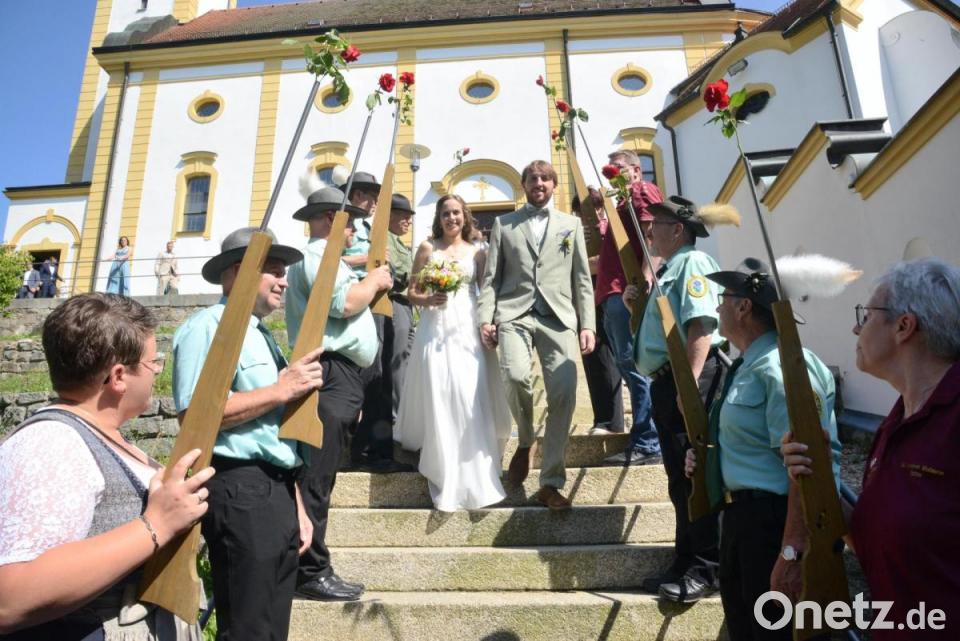 David und Luisa Piehler, geborene Zeug, schlossen am Samstag in der Pleysteiner Kreuzbergkirche den Bund fürs Leben. Pfarrer Georg Hartl traute das Paar. Der 30-jährige Verwaltungsfachwirt beim Landesamt für Finanzen und die 29-jährige Diplom-Verwaltungswirtin (FH) waren sich im Sommer 2009 im Schützenverein Grenzland-Waldheim zum ersten Mal begegnet. Ein Jahr später beim Faschingsball des Schützenvereins Grenzland-Waldheim wurden sie ein Paar. Vierzehn Jahre waren die beiden zusammen, bevor David an Heiligabend im Jahr 2023 Luisa einen Heiratsantrag machte. Dieser war in einem "Bayernlos" versteckt. Statt eines Geldgewinns gab es als Hauptgewinn den weiteren gemeinsamen Lebensweg. David und Luisa Piehler wohnen jetzt in Neudorf bei Neukirchen/St. Christoph in der Gemeinde Georgenberg. Dass Ruhestandspfarrer Georg Hartl das Paar traute, hat einen besonderen Grund: Er hatte Luisa Zeug getauft und als Mädchen war die Braut lange Zeit Ministrantin bei Pfarrer Hartl in der Pfarrei Waidhaus. Der Chor Amicanti-Waldthurn unter Leitung von Manuela Grünauer gab dem Gottesdienst in der Kreuzbergkirche einen würdigen Rahmen.