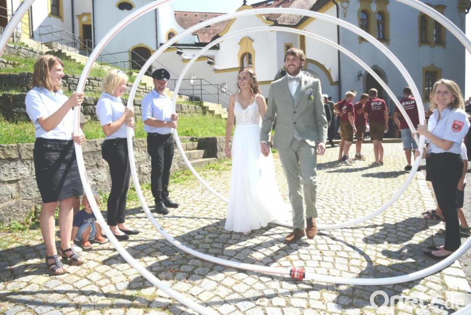 Nach der Trauung wünschten alle Hochzeitsgäste und Besucher des Gottesdienstes dem frisch getrauten Paar alles Gute und eine glückliche Zeit. Der Musikverein Waidhaus überbrachte seine Glückwünsche mit Marschmusik. Bei der Feuerwehr Neudorf durfte das Paar durch eine Schlauchspirale schreiten und dann ein „brennendes“ Häuschen löschen. Bei der Katholischen Jugend Neudorf musste das Paar ein Herz ausschneiden, durch das der Bräutigam die Braut tragen durfte, doch zuerst standen die Schützenvereine Grenzland Waldheim und „Enzian“ Frankenreuth mit in die Höhe gehaltenen Gewehren in deren Lauf eine rote Rose steckte, Spalier.